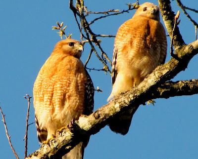 Our photostudy today is going to be about this little red shouldered hawk-Little Rambo. He is building a nest in the pine tree next to this tree you see.